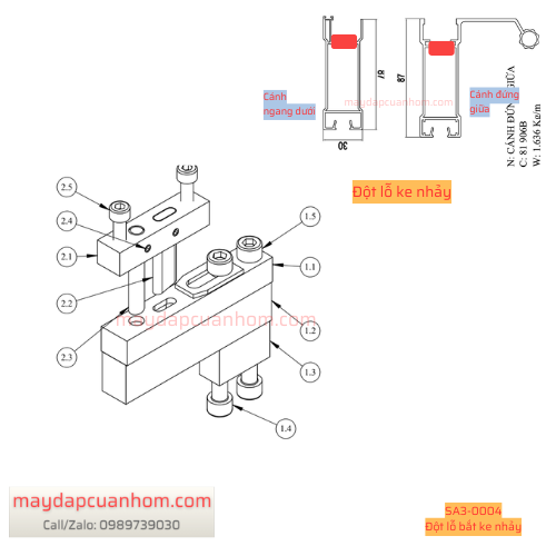 Đột lỗ ovan 7*16mm và lỗ phi 10 nút nhảy trên thanh nhôm (số 2, 3 trong hình) để bắt ke nhảy ghép góc.