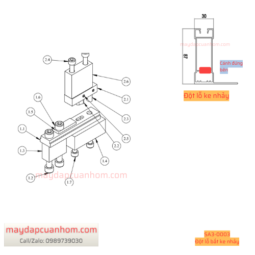 Đột lỗ ovan 7*16mm và lỗ phi 10 nút nhảy trên thanh nhôm (số 6 trong hình) để bắt ke nhảy ghép góc.