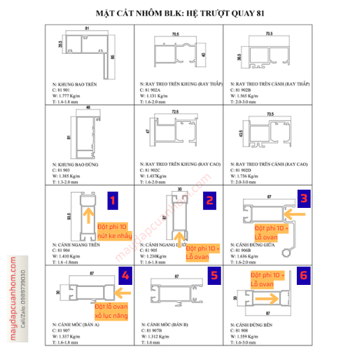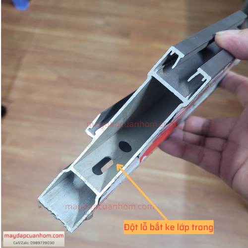 Đột lỗ ovan 7*16mm và lỗ phi 10 nút nhảy trên thanh nhôm (số 1 trong hình) để bắt ke nhảy ghép góc.