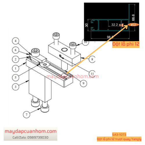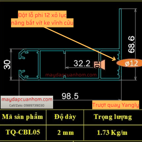 Lỗ đột trên cây nhôm: Đột lỗ phi 12 xỏ lục giác bắt ke cửa trượt quay Yangly