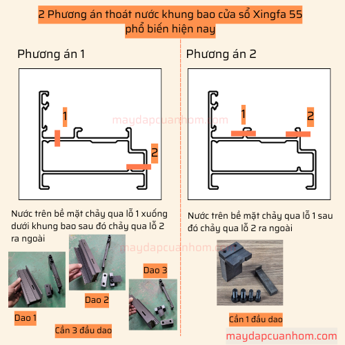 Có 2 phương án đột lỗ thoát nước cửa sổ mở quay XF55 phổ biến.