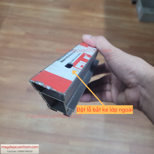 Đột lỗ ovan 7*16mm trên thanh nhôm (số 4 trong hình) để xỏ lục năng vặt ốc ke nhảy siết góc.