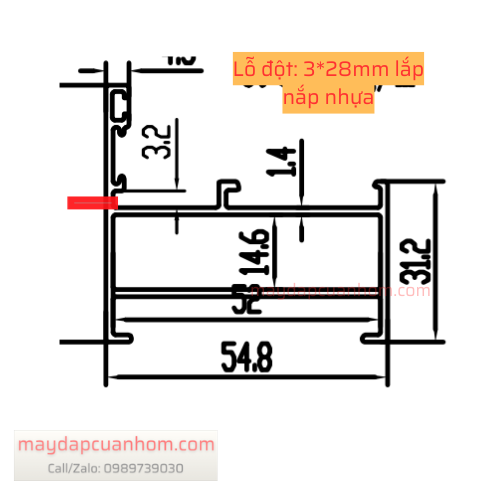 Lỗ đột trên cây nhôm: Đột lỗ hình chữ nhật kích thước 3*28mm