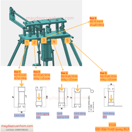 Máy dập làm trọn bộ hệ nhôm BLK trượt quay 81 hoặc zhongkai trượt quay đột ke nhảy, đột lỗ xỏ lục năng, đột lỗ lắp chốt phụ kiện.