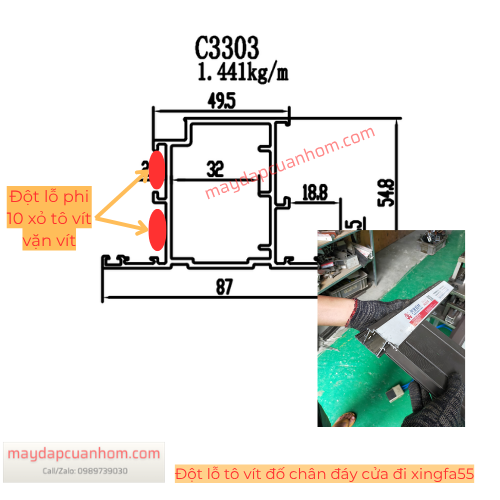 Đầu đột đột 4 lỗ phi 10 trên cây đứng để đưa tô vít vào để vắn vít với cây đố ngang cửa đi xingfa 55