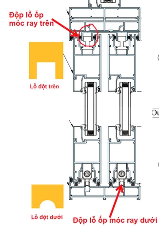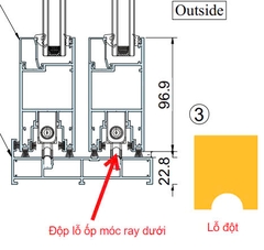 - Kích thước lỗ đột: Rộng 8mm dùng để chạy ray dưới trên bậu Inox đặt trên khung bao cửa lùa 80, 94, 120, 180...
