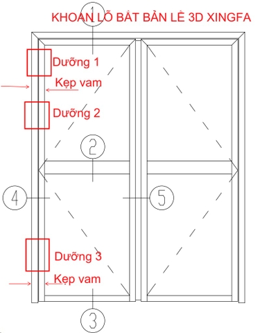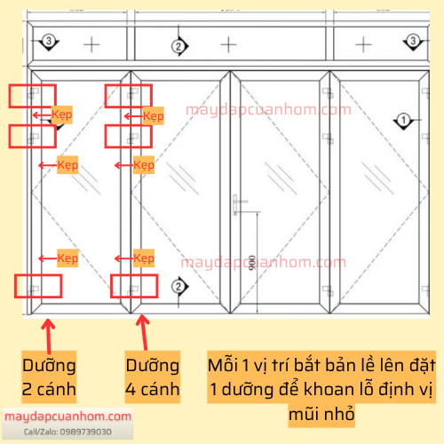 Mỗi 1 vị trí bố trí lắp bản lề lên đặt 1 dưỡng sau đó kẹp chặt lại