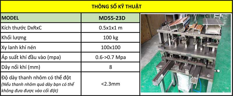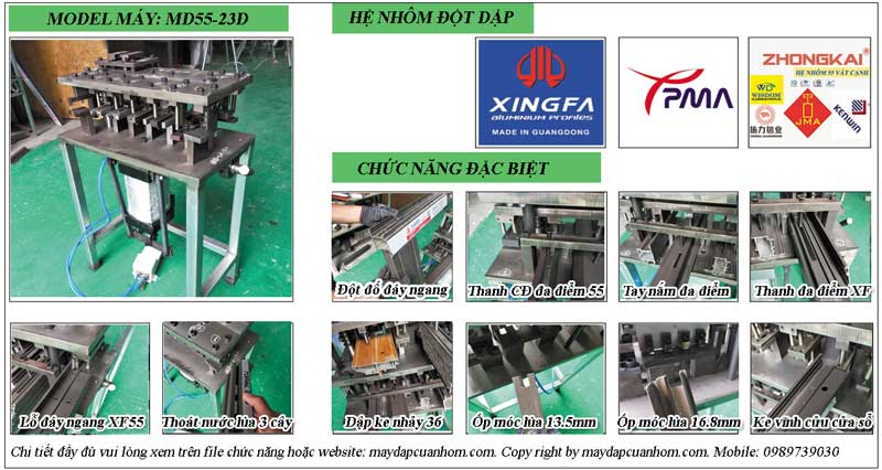Máy dập nhôm MD55-23D là bộ khuôn đột dập được cải tiến với nhiều tính năng đặc biệt như đột tay nắm đa điểm và đột đố đáy ngang cho hệ nhôm Xingfa 55 và hệ vát cạnh 55. Máy đột dập MD55-23D sử dụng 23 đầu dao đột dập khác nhau sẽ là mẫu máy chuyên nghiệp trong ngành sản xuất nhôm kính năm 2021, bạn sẽ không phải sử dụng máy cắt để khoét lỗ tay nắm hay cắt gân lắp khóa đảm bảo sự an toàn và thuận tiện nhất trong sản xuất cửa nhôm.