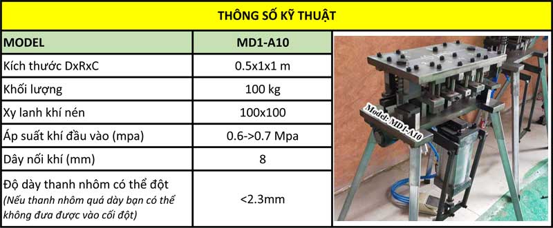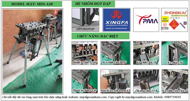 Máy dập hệ mở quay 10 dao MD1-A10 là model máy đột dập được dùng chủ yếu cho hệ nhôm Xingfa 55, xếp trượt 63 và hệ nhôm vát cạnh 55 trên các công đoạn liên quan đến đột ke nhảy và ke vĩnh cửu các hệ nhôm trên. Ngoài ra, MD1-A10 còn có chức năng đột lỗ thoát nước khung bao cửa sổ mở quay ngoài, đột lỗ thoát nước khung bao lùa 3 cây với các đầu dao dập được bố trí hợp lý trên khuôn dập đảm bảo thao tác đơn giản, dễ dàng hơn.